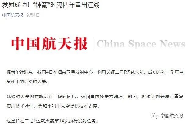 9月4日,我國在酒泉衛(wèi)星發(fā)射中心用長征二號F運(yùn)載火箭成功發(fā)射一型可重復(fù)使用的試驗(yàn)航天器。試驗(yàn)航天器在軌飛行2天后,于9月6日成功返回預(yù)定著陸場。這次試驗(yàn)的圓滿成功,標(biāo)志著我國可重復(fù)使用航天器技術(shù)研究取得重要突破,后續(xù)可為和平利用太空提供更加便捷、廉價(jià)的往返方式。