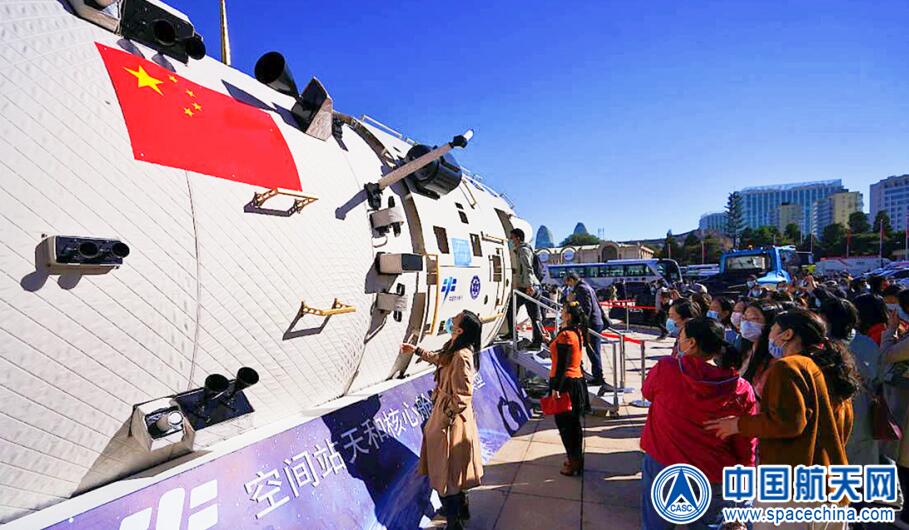 圖為現(xiàn)場(chǎng)觀眾正在排隊(duì)體驗(yàn)空間站天和核心艙模型。 宿東 攝