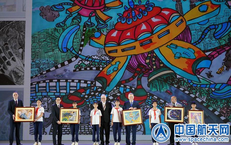 大會(huì)開幕式上舉行了“我的太空夢(mèng)”航天主題繪畫贈(zèng)禮。來自海南省文昌市龍樓鎮(zhèn)航天小學(xué)的小朋友們展示了精心創(chuàng)作的繪畫作品,分享了背后的創(chuàng)作故事,并向外賓贈(zèng)送作品。